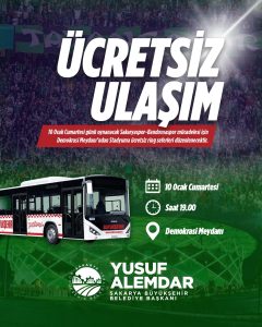 Büyükşehir’den Sakaryaspor maçı için ücretsiz ring seferi Büyükşehir Belediyesi, 10 Ocak Cumartesi günü oynanacak Sakaryaspor–Keçiörengücü maçı öncesinde taraftarlara ücretsiz ulaşım kolaylığı sağlayacak. Demokrasi Meydanı’ndan 17.00-19.00 saatleri arasında...