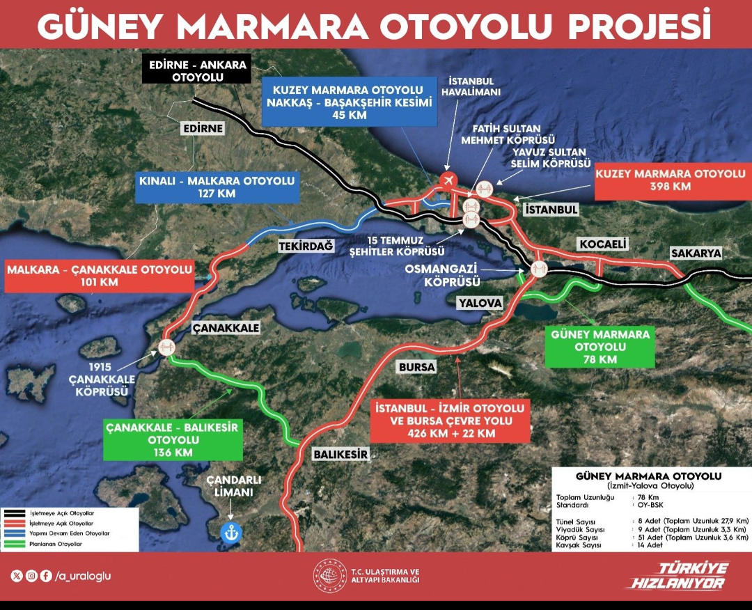 Ulaştırma ve Altyapı Bakanı Abdulkadir Uraloğlu, Güney Marmara Otoyolu Projesi’ne ilişkin yaptığı açıklamada, Marmara Bölgesi’nin Türkiye sanayisinin lokomotifi konumunda olduğuna dikkat çekti. Bakan Uraloğlu, 2024 yılı itibarıyla toplam ihracatı 60 milyar doları aşan Kocaeli, Bursa ve Sakarya’nın bu projeyle birlikte birbirine daha güçlü şekilde bağlanacağını belirterek, karayolu taşımacılığının daha hızlı, daha güvenli ve daha etkin hale geleceğini söyledi.