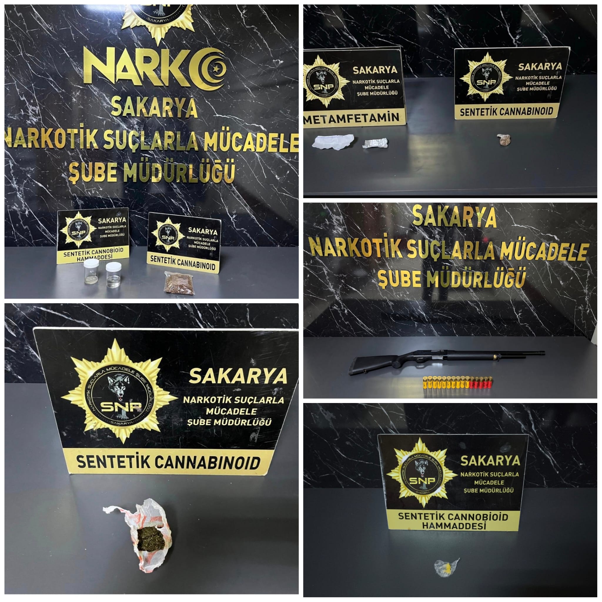 Yapılan aramalarda sentetik cannabinoid, metamfetamin, uyuşturucu yapımında kullanıldığı değerlendirilen maddeler ile ruhsatsız pompalı tüfek ve kartuş ele geçirildi.